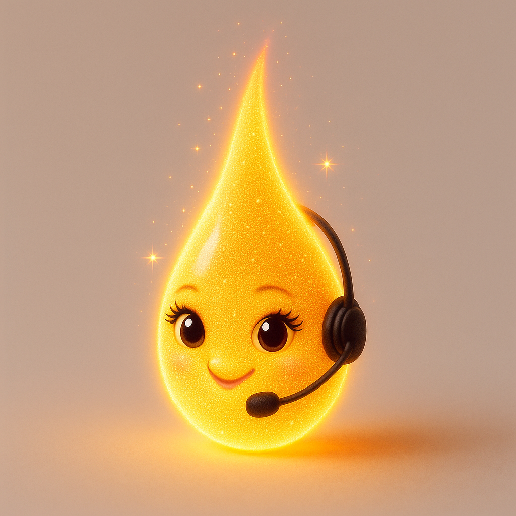 A cartoon illustration of a glowing, sparkling yellow teardrop-shaped character with big eyes, eyelashes, a smile, and a black headset with a microphone.
